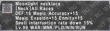 Erilaz Galea +3 icon.pngErilaz Galea +3 description.png Moonlight Necklace icon.pngMoonlight Necklace description.png Magnetic Earring icon.pngMagnetic Earring description.png Alabaster Earring icon.pngAlabaster Earring description.png